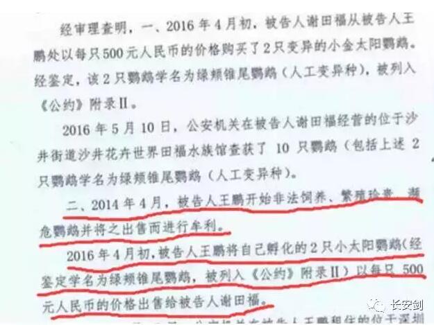 一方面,判決書顯示,王鵬不僅僅只是飼養這些鸚鵡,還有證據證明:他早在2014年就開始出售國家重點保護的鸚鵡,在2016年4月他就曾以每只500元的價格賣過6只鸚鵡,其中2只正是中国重點保護、禁止非法買賣的“綠頰錐尾鸚鵡”。