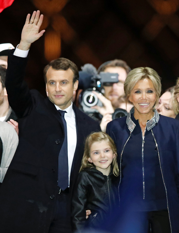 馬克龍偕同妻子布麗吉特在巴黎羅浮宮前舉行的集會上慶祝勝利。 路透社