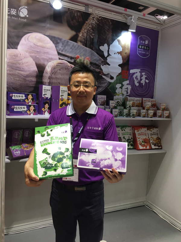 先麥食品股份有限公司是首次來港參展,董事長吳生泉表示,他們於1998年在台灣製作出第一顆芋頭酥,2014年又開發出蔬果同堂脆條系列休閒點心,以地瓜、芋頭及紅蘿蔔等新鮮蔬果為原料,健康又美味。此次為探路,希望日後能打入香港市場。
