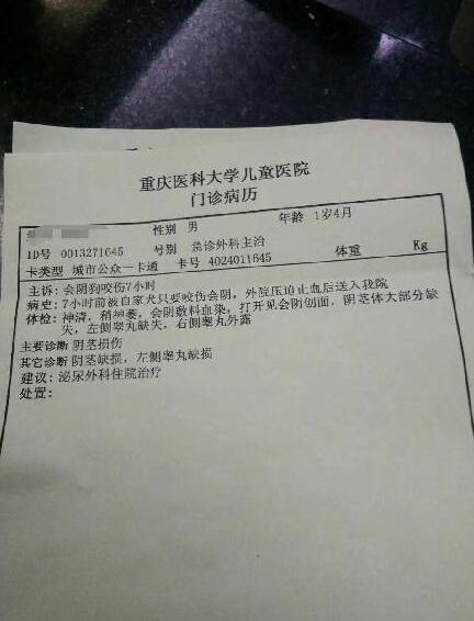 5月7日下午,記者在重慶醫科大學附屬兒童醫院見到了男童的父親張天飛,他說,事情發生在5月6日早上8點左右,當時他正在彭水縣城務工。出事時,3歲大的女兒正在睡覺,父親在樓下也沒發現,妻子買米回來后發現孩子出事了,趕緊叫鄰居給我打電話。我急沖沖趕到家后,兒子被妻子抱在懷里,孩子褲子上血跡斑斑,陰莖部位被小狗咬得血肉模糊,屋外的小狗嘴角旁還帶有血跡。