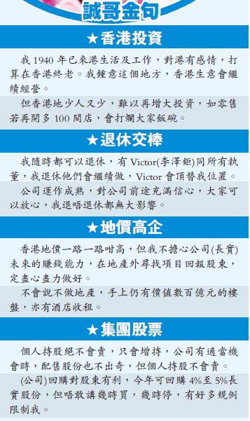 長和昨日股東大會,主席李嘉誠再談退休一事。他表示,有兒子李澤鉅及其他高層坐鎮,就算自己退休亦不會對公司有影響。他還明言,自己股票不會賣,并會繼續在香港做生意,「我睇我都會喺香港終老。」