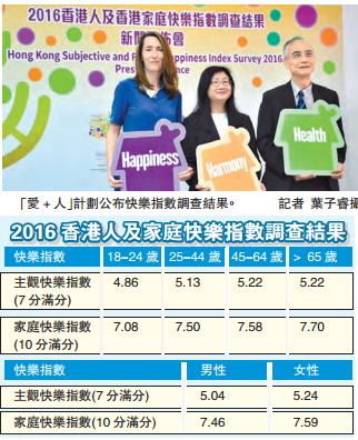 「愛+人」計劃的調查顯示,以10分為滿分計算,香港人的主觀快樂指數平均值為6.92,而家庭快樂指數平均值為7.53,高於屬「一半半」的5分,顯示港人大多數快樂。另外,在社會人口特徵的調查方面,發現18至24歲年輕人快樂指數低,45歲以上人士最快樂;家庭總收入越高,快樂指數越高,但家庭收入少於1萬元人士的快樂指數,與收入介乎1萬至1萬9千元的人士相若;以及女性比男性快樂。
