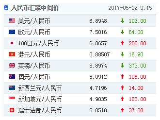 5月12日,人民幣(6.9011, -0.0011, -0.02%)兌美元中間價報6.8948,較上日中間價6.9051升值103個基點。上日官方收盤報6.9035,夜盤收盤報6.9025。