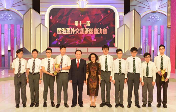 「第11屆香港盃外交知識競賽」決賽昨日在將軍澳電視城舉行,多位嘉賓出席,包括候任行政長官林鄭月娥、外交部駐港特派員公署署理特派員佟曉玲、中聯辦副主任譚鐵牛、外交部駐港特派員公署副特派員宋如安、基本法委員會副主任梁愛詩及教育局局長吳克儉等。