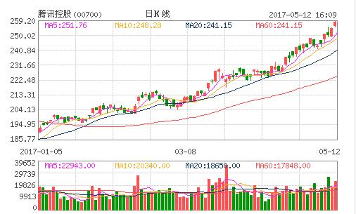 納指再創收市新高,恒生指數今早高開0.31%,藍籌股普遍上漲,騰訊漲0.7%,報260港元,再創上市新高,市值達25千億。