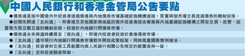 至於「北向通」,遵守現行內地銀行間債券市場對外開放政策框架,亦尊重國際慣例做法。「北向通」投資者和交易工具範圍均與人民銀行相關公告規定的範圍保持一致,通過兩地基礎設施機構之間合作互聯,境外投資者可更便捷投資內地債券市場、配置人民幣資產和進行相關風險管理,「北向通」沒有投資額度限制。簡單說,債券通開通后,境外投資者無須先將資金調入內地,只要在境外參與「債券通」的銀行開設相關戶口,便可買賣內地在交易所上市的債券,以及占內地整體債市90%的銀行間債券市場。