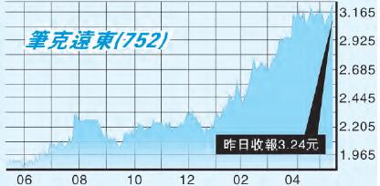 筆者於2月中曾經推介筆克遠東(752),當時股價約2.7元,昨天其股價再創新高,已升至3.24元收市,較推介時升約兩成,對讀者有交代。筆克遠東現價市盈率約13倍,不算高;息率有5.2厘,仍有吸引力。