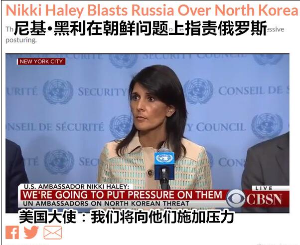 路透社相關報道稱,黑利還發誓,美國將“點名”(call out)某些支持朝鮮的國家。她說,其他國家必須作出選擇,是支持朝鮮,還是那些反對朝鮮核導項目的國家。