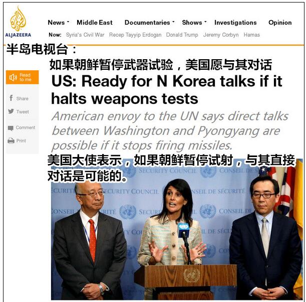據半島電視臺的報道,黑利16日新聞發布會上的講話時就強調,“北京是朝鮮唯一的外交和軍事盟友”。上周末,她在聯合國安理會上的發言中,也把中國稱為“朝鮮的鄰居和盟友”,她當時表示,“在如何回應朝鮮試射導彈問題上,相信美國和其他國家會同意‘朝鮮的鄰居和盟友’中國的態度(United States and others would agree with North Korea's neighbor and ally China on how to respond to the launch)”。