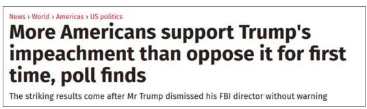 獨立報截圖:大多數美國人支持彈劾美國總統特朗普,這是支持彈劾的人數首次超過反對彈劾的人數。