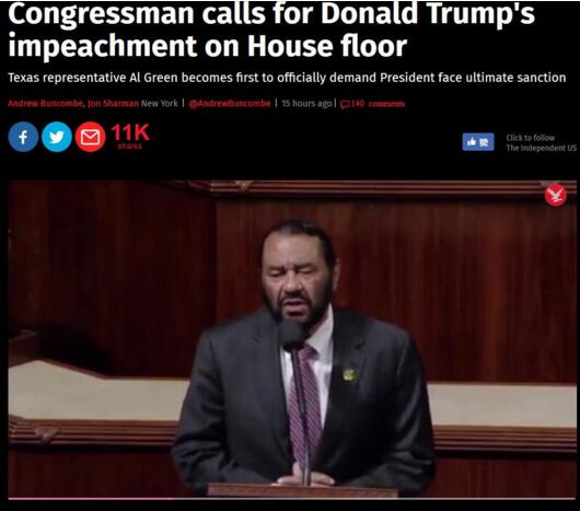 據美國國會山報(The Hill)17日報道,民主黨的眾議員格林(Al Green)17日呼吁彈劾特朗普,格林成為首個在國會正式要求起訴特朗普的國會成員。