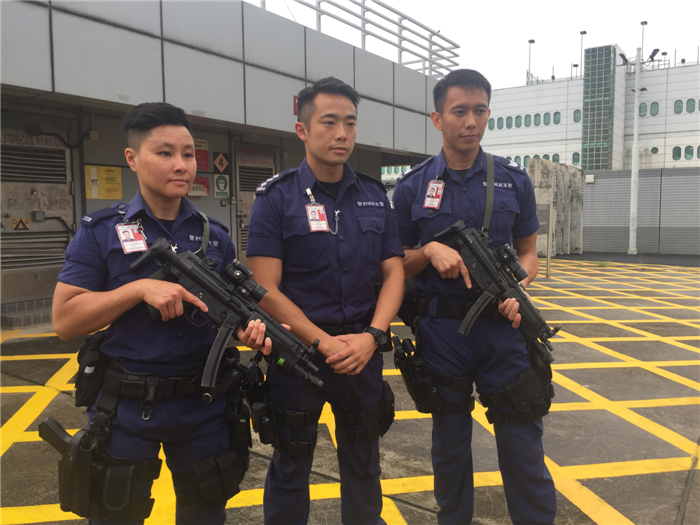 (左起)機場特警組警員賴慧君、總督察劉冠騰及警長陳哲丞接受訪問,及展示其裝備