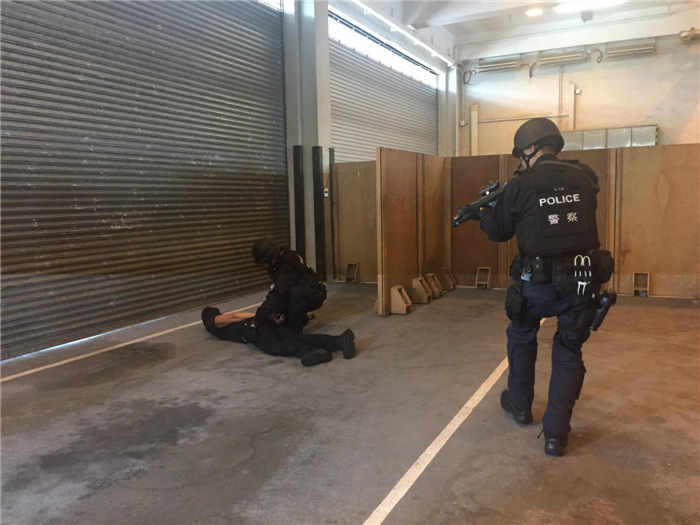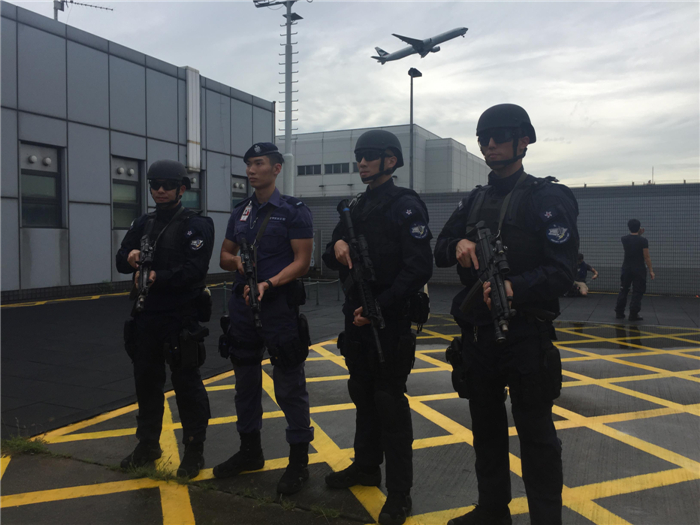 駐守赤鱲角機場的機場特警組,本月中向傳媒展示日常工作。機場特警為記者作了反恐模擬演練,演練模擬有恐怖分子佔領了機場商戶的辦公室,恐怖分子分別持有刀及槍枝,特警到場後迅速將持刀恐怖分子制服,經過一輪駁火,特警攻入辦公室房間,將持槍的恐怖分子一併制服。