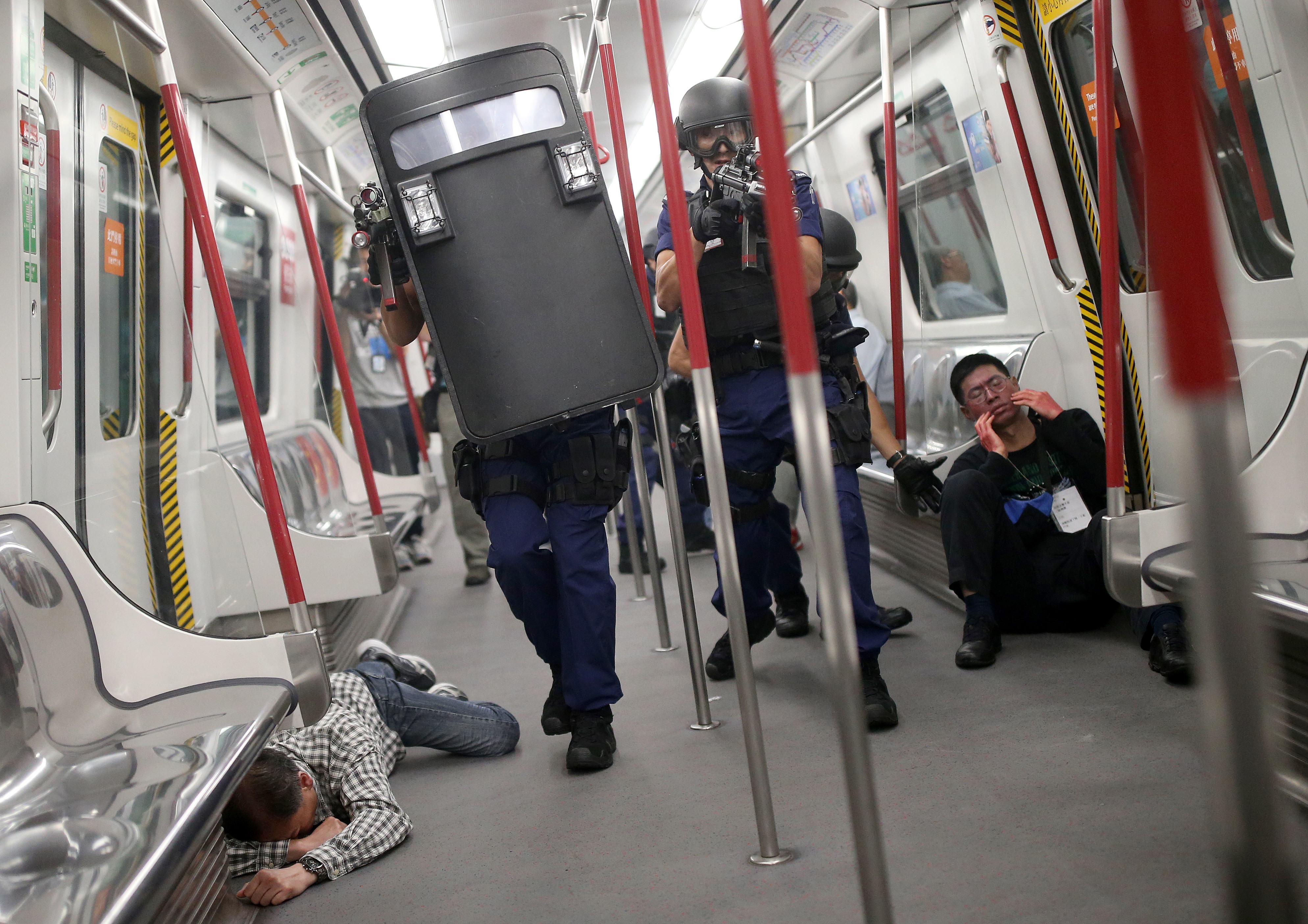 演習分別設定了不同場景,其中一齣重頭戲,乃一名可疑人士登上停泊在機場站的列車並「點燃」汽油彈放火,隨後以開山刀「襲擊」車上多名乘客,並挾持一名乘客到月台上,港鐵車站職員見狀即時將情況通知車務控制中心報警;及後「兇徒」與接報趕至的首批警員對峙,警員利用其專業知識迅即控制場面,又分批協助車上乘客離開險境。未幾,配備輕機槍及盾牌的機場特警趕至增援,最終將「兇徒」制服及拘捕。