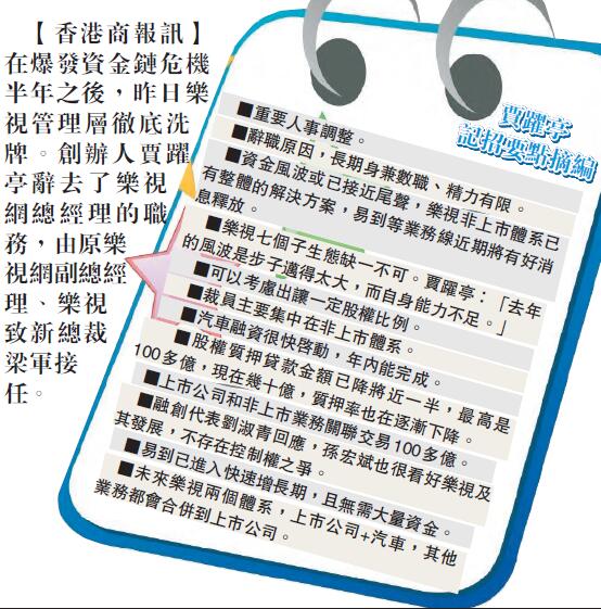 【香港商報网訊】在爆發資金鏈危機半年之後,昨日樂視管理層徹底洗牌。創辦人賈躍亭辭去了樂視網總經理的職務,由原樂視網副總經理、樂視致新總裁梁軍接任。