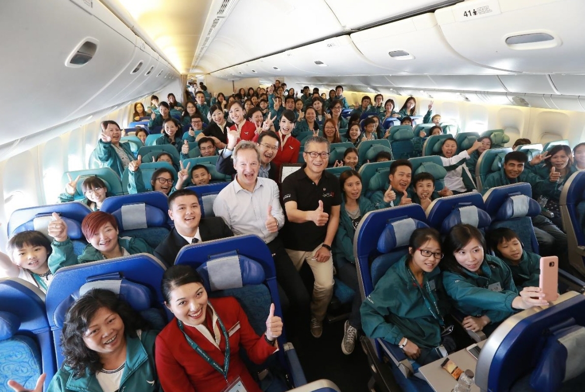 财政司司长陈茂波(二排左五)、连同国泰航空行政总裁何杲与230位参加者在航机上合照。