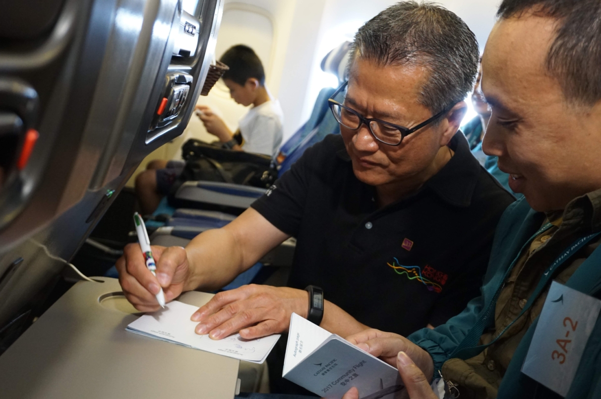 參加者早上9點已齊集機場,他們一一體驗「Check-in」、過關等程序。在飛機上小朋友和家長一嘗「飛機餐」后,陳茂波與國泰航空行政總裁何杲便在機上與參加者交流,并送上小禮物。每人手上亦持有一本「護照」,大家都紛紛邀請嘉賓簽名留念。陳茂波更與他們一一「自拍」,十分親民。