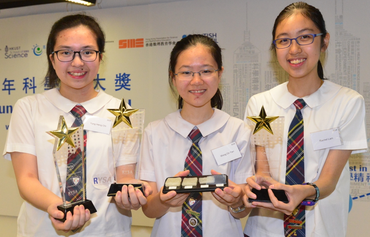 「羅氏少年科學家大獎2017」聖保祿學校凭着人工皮肤勇夺冠军。左起:容幸之、黃安恩、林芷彤展示其作品及奖杯。记者 冯俊文摄