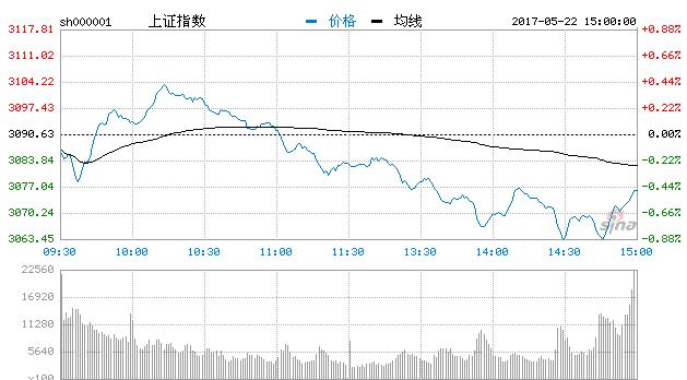 新浪財經訊 5月22日消息,滬深兩市早盤低開,隨後展開一波反攻,但滬指及創指遇到相同情況,即攻擊20日均線無功而返,下午即“一瀉千裏”,滬指及創指均持續下挫,盡管盤中也有雄安概念反彈提振行情,但在無持續性主題熱點拉動下,創指盤中一度跌逾1%。截止收盤,滬指報3075.68,跌0.48%,創指報1788.08,跌0.72%。