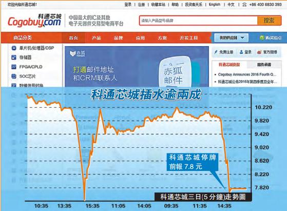 【香港商報网訊】記者鄭珊珊報道:香港科網股成為沽空機構眼里的「香餑餑」,各大沽空公司都想來「咬一口」。繼瑞聲科技(2018)之后,昨日本港另一隻科網股科通芯城(400)亦遭狙擊。科通芯城開市報10.12元,受沽空報告拖累,股價急瀉兩成,盤中跌幅一度擴大至25%,低見7.3元。下午2時50分,公司宣布緊急停牌,停牌前報7.8元。