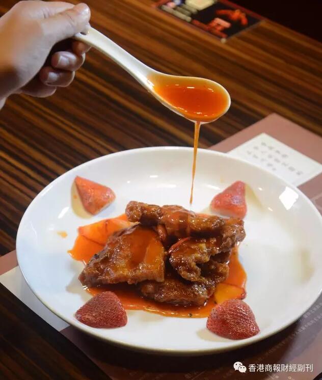 來這裏還不可不試劉師傅拿手菜士多啤梨骨,只用豬最尾4行腩排,貪它肥瘦相間,配上用法國士多啤梨醬及新鮮士多啤梨打成的醬汁,那股天然的草莓味濃鬱開胃。另一心水之選鐵板蒜蓉豬腿肉,製作過程繁複需5小時,師傅先將新鮮豬腿放入藥材湯底慢燉,再去骨輕炸,封存表面以保留肉汁,上碟時伴以洋蔥、番茄,最後倒入以一半炸蒜一半生蒜調和的醬汁,吱吱作響,分外惹味。