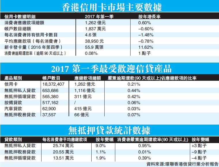 據了解,目前本港市場上有多種信貸產品。在環聯報告中,雖然信用卡仍然是在2017年第一季最受歡迎的信貸產品,但無抵押私人貸款及無抵押循環貸款的受歡迎程度也在趕超信用卡。特別是無抵押私人貸款,在2017年首季更錄得最大幅度的應繳款項增長。