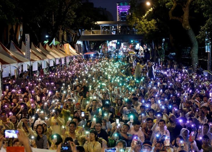同性婚姻支持者昨晚聚集在立法院外庆祝释宪结果,并以手机打出彩虹灯光。(路透社)