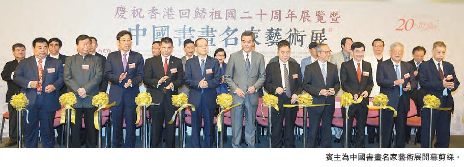 【香港商報网訊】記者李嘉倩報道:由香港各界文化促進會主辦的「慶祝香港回歸祖國二十周年展覽暨中國書畫名家藝術展」,前日假香港中央圖書館展覽館隆重揭幕,行政長官梁振英、全國人大常委柳斌杰、中聯辦副主任楊健、民政事務局局長劉江華等應邀主禮。梁振英赞揚此次展覽既呈現了香港回歸祖國的歷程和20年來的發展,亦展現了中國近代和當代藝術精彩多元的面貌。是次展出200多幅中國近現代書畫名家作品,包括張大千、黃永玉、饒宗頤、金庸等,展期至29日。