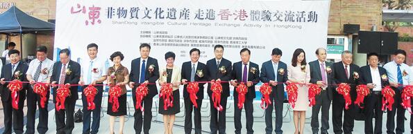 眾嘉賓為「山東非物質文化遺產走進香港體驗交流活動」開幕剪綵。