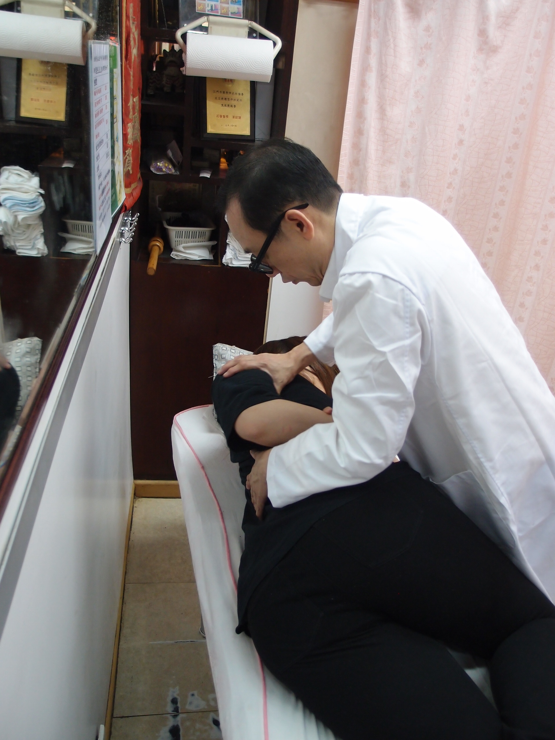 患者膝蓋內側肌肉裂開,已痛了兩周才求診。湯師傅首天只能在受傷部位輕按再敷以中藥,開了生肌藥先修復拉傷的筋肉組織筋膜,第二天疼痛症狀明顯改善,湯師傅可以手檢查其斷裂位,為軟組織按摩,讓氣血暢通:「中醫學叫這做『以痛為俞』,在不痛的地方用力,遠端治療近端,以小痛治大痛。只要掌握好這些自古以來的心法,每每治療起來都得心應手。」