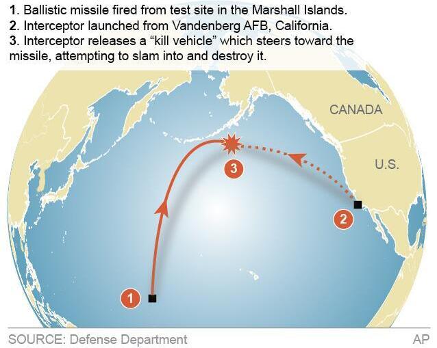 报道说,拦截导弹进入外层空间后,将释放出“杀伤飞行器”,利用其动能摧毁来袭目标,拦截将在太平洋上空完成。