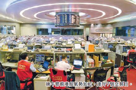 端午節前港股保持了七連升氣勢,上揚62點至25702點,但在北水休戰下成交額僅608億元。港股焦點為內房股,自上周恒大(3333)全面發力急升17%後,整個板塊再度活躍起來,內房股於周一基本全面看漲,稍為落後的禹州地產(1628)、融信中國(3301)更分別大升3.2%及3.9%,是二線內房中表現最為搶眼的。