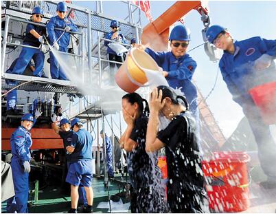 5月27日,女科學家張維佳和女潛航學員趙晟婭在執行中國大洋38航次第三航段第3潛任務時,最大潛深達6544米。圖為張維佳和趙晟婭深潛歸來接受“洗禮”。新華社記者劉詩平攝