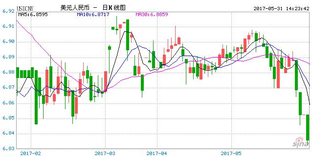 5月31日,午后在岸、離岸人民幣(6.8286, -0.0245, -0.36%)雙雙大漲。