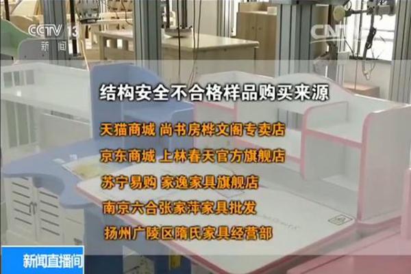 經過檢測發現,150批次兒童家具中,有16批次樣品其它結構安全項目不合格。不合格樣品中14批次是網絡買樣,其中12批次從天貓商城購買,京東商城和蘇寧易購分別有1批次樣品不合格,南京市和揚州市的實體店購買的樣品也各有1批次不合格。
