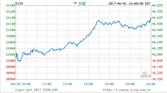 美東時間6月1日16:00(北京時間6月2日04:00),道指漲135.53點,或0.65%,報21,144.18點;標普指數(2430.0601, 18.26, 0.76%)漲18.26點,或0.76%,報2,430.06點;納指漲48.31點,或0.78%,報6,246.83點。