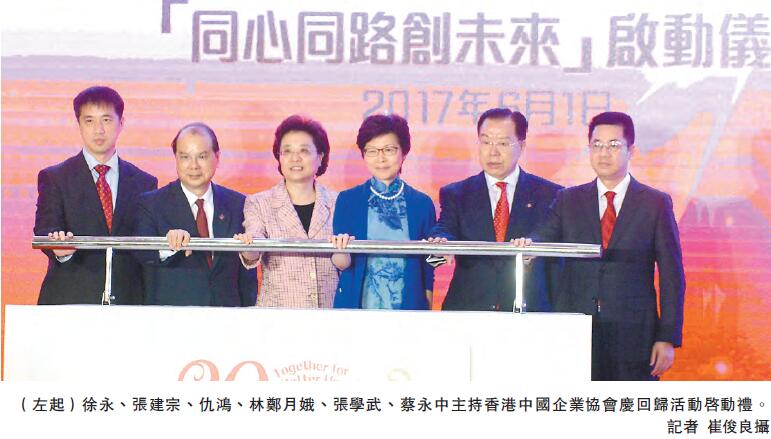 【香港商報网訊】記者李嘉倩報道:香港中國企業協會昨日假灣仔會展中心隆重舉行「慶祝香港回歸祖國20周年系列活動暨『中資企業公益月』啟動禮」,候任行政長官林鄭月娥,政務司司長張建宗,中聯辦副主任仇鴻,外交部駐港特派員公署參贊徐永,解放軍駐港部隊副政委、少將蔡永中等蒞臨主禮,與該會名譽會長張學武等賓主逾400人共同見證盛事。