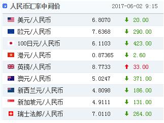 6月2日,人民幣(6.8028, -0.0127, -0.19%)兌美元中間價報6.8070,較上日中間價6.8090升值20個基點。升值幅度較上日的543點大大縮小。