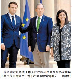 【香港商報网訊】被聯合國委任為氣候特使的前紐約市長彭博,當地時間2日專程與新任法國總統馬克龍會面。彭博強調,任何環保政策都有賴地方政府及各大商業機構落實和執行。即使美國聯邦政府放軟手腳,但只要該些單位在減排方面加倍努力,一樣可以在限期前達標,甚至超標。