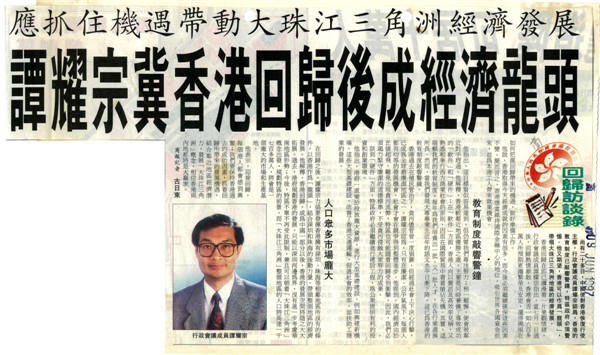 「國家并不希望香港變成一個內地城市,反而希望利用香港優勢,令兩地優勢互補。」譚耀宗由衷表示,「我深深覺得香港是一塊福地。」香港具有優越的地理條件和國際化優勢,加上國家不斷壯大發展,面對如此良好的契機,香港內部沒有理由再掀起太多爭拗,而要與國家齊頭并進,發展經濟、保障民生,永葆強大的競爭力。