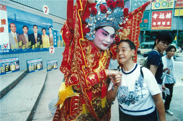 1998年特區首屆立法會選舉中,譚耀宗變身戲劇人物為自己及團隊造勢。資料圖片