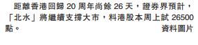 【香港商報网訊】記者鄺偉軒報道:距離香港回歸20周年尚餘26天,證券界預計,「北水」將繼續支撐大市,料港股本周上試26500點;雖然倫敦恐襲促使地緣政治風險升溫,惟對港股影響不大。