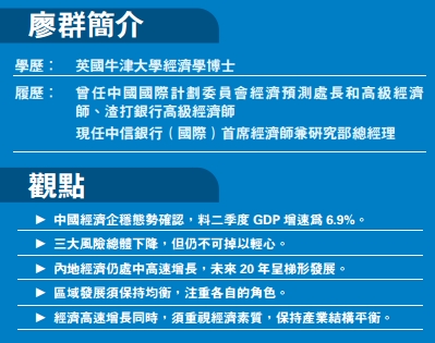 另外,就總體而言,廖群認為,中國經濟在今后4年會呈現「L形」增加,即經濟保持增長,但增加速度會有所放緩。而長期來看,今后20年,中國經濟都會保持中高速增長,但是增長速度會逐步呈現「梯形」放緩。