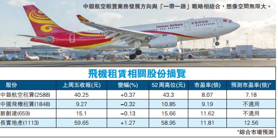 市場亦料,全球新生產的3.9萬架飛機中,有1.5萬架將會在亞太區使用,其中6000架將由國內航空公司使用,預計經營性租賃滲透率於2020年將達致大約40%。隨飛機租賃業務興起,內地不少銀行開始投資,飛機租賃前景佳。