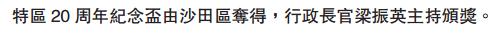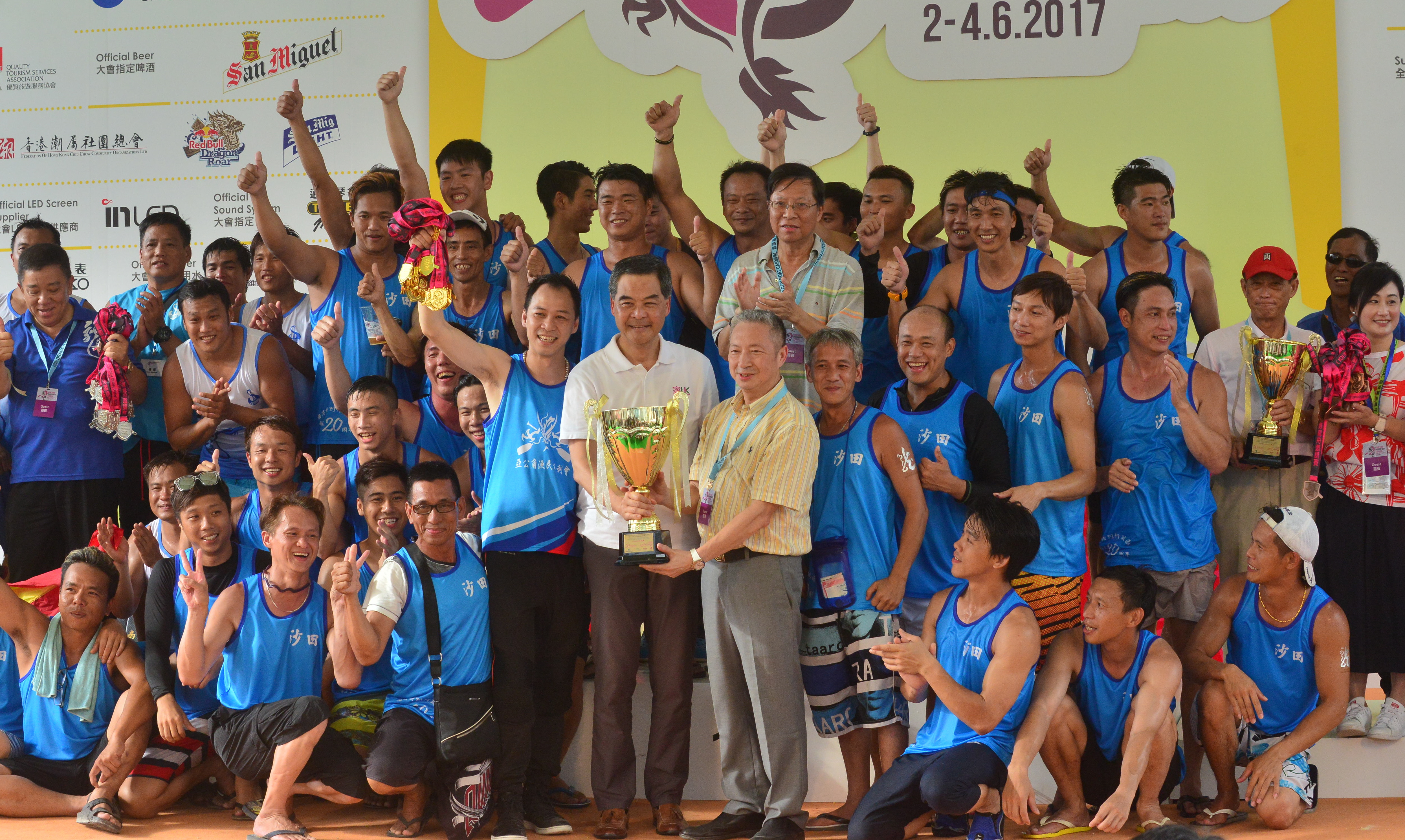 【香港商報网訊】記者葉子睿報道:由香港旅游發展局主辦的「香港龍舟嘉年華」昨日圓滿結束,其中為慶祝香港特區成立20周年舉辦的競賽項目「香港特別行政區成立20周年建行(亞洲)紀念盃」,由全港18區派出龍舟隊角逐,結果由沙田區奪冠,南區及離島區分別獲亞軍及季軍,行政長官梁振英負責頒獎予冠軍隊伍。
