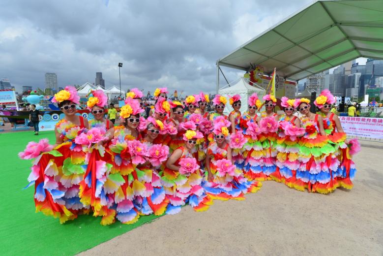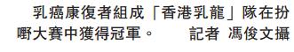 在「扮嘢大賽」中獲得冠軍的「香港乳龍」,是首隊由乳癌康復者、康復者家人及朋友組成,年齡介乎25至65歲。服裝設計師鄭小姐指,服裝準備了1個月,而選用牡丹花的原因是漂亮和高貴。隊伍中穿上女裝的男士都是康復者的丈夫,他們均表示滿意服裝,及不抗拒。