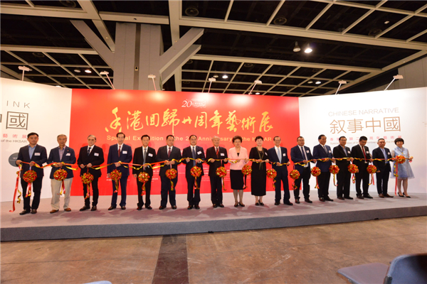 【香港商報网訊】記者曾美玲報道:由香港僑界社團聯會、南京百家湖國際文化投資集團合辦的「水墨中國敘事中國--香港回歸20周年藝術展」日前舉行開幕式,中聯辦副主任殷曉靜、中國公共外交協會會長李肇星、中華全國歸國華僑聯合會副主席康曉萍、外交部駐港副特派員胡建中等應邀主禮,與在場近300人齊賀盛事。藝術展於本月1至7日在香港會議展覽中心3B展覽廳舉行,共展出85位藝術家的約300件藝術品,分享香港回歸祖國20周年的喜悅。