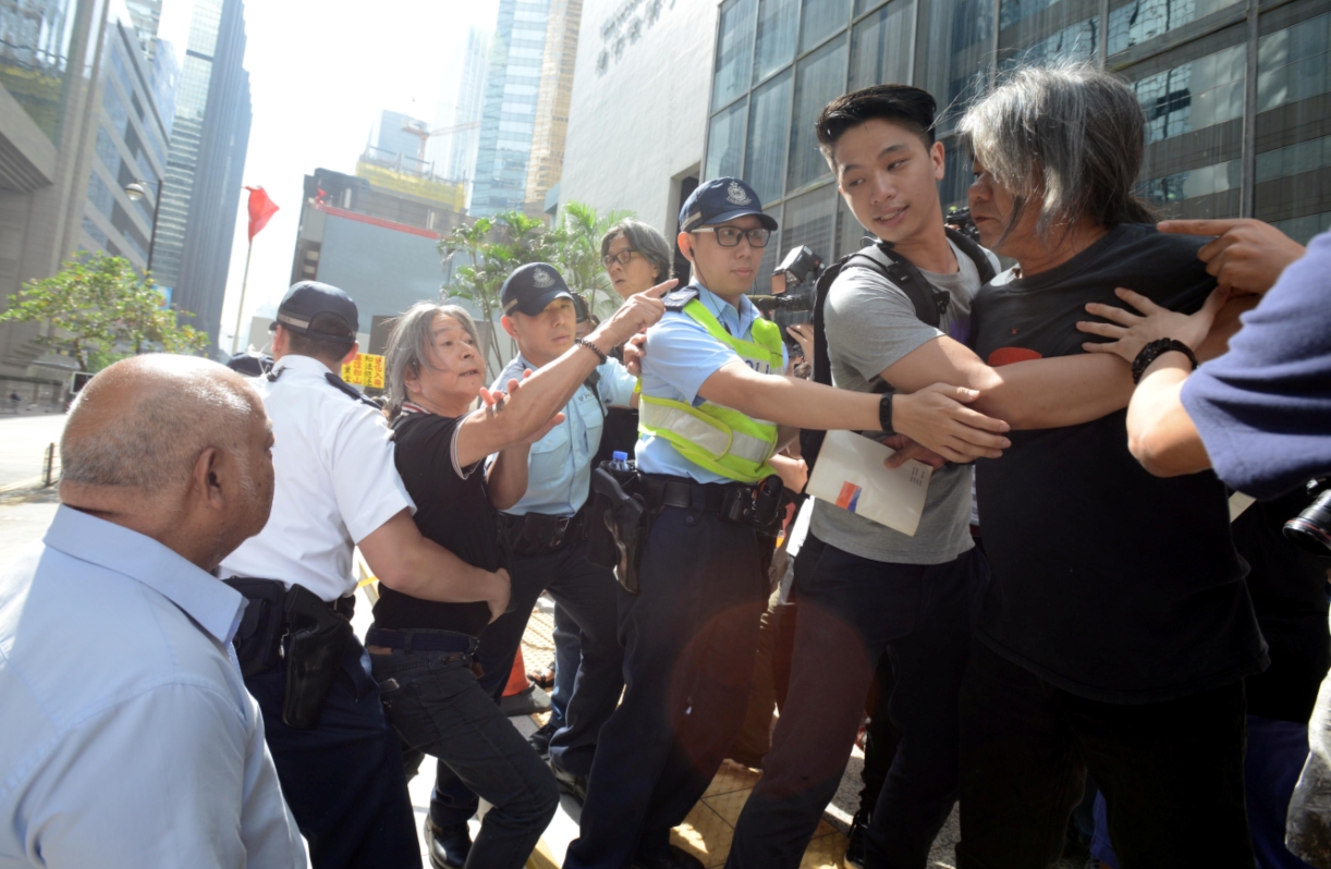 示威市民气愤指骂梁国雄。记者 崔俊良摄
