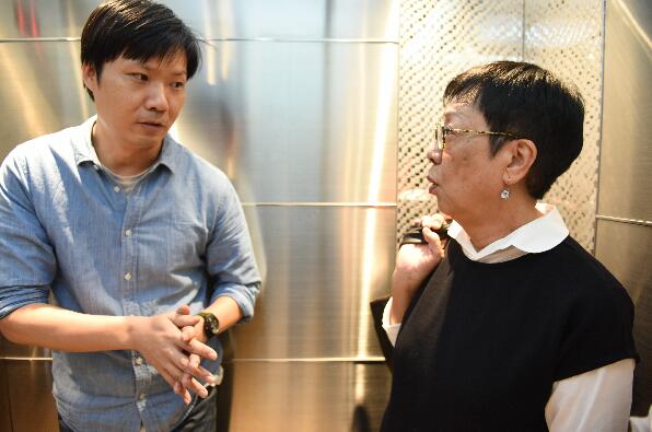 许鞍华(右)在电梯遇到影迷探讨作品 (新華社)