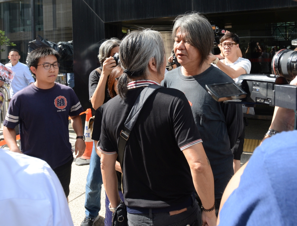 「長毛」梁國雄(右)日前出庭受審,於法院外與示威市民對峙。